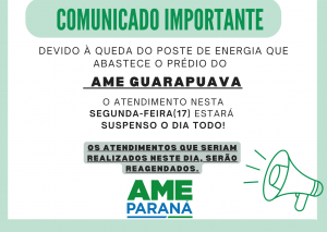 Devido a queda do poste de energia que abastece o prédio do Ambulatório Médico de Especialidaes (AME), os atendimentos aos pacientes estão suspensos nesta segunda- feira (17). As consultas marcadas serão reagendadas.