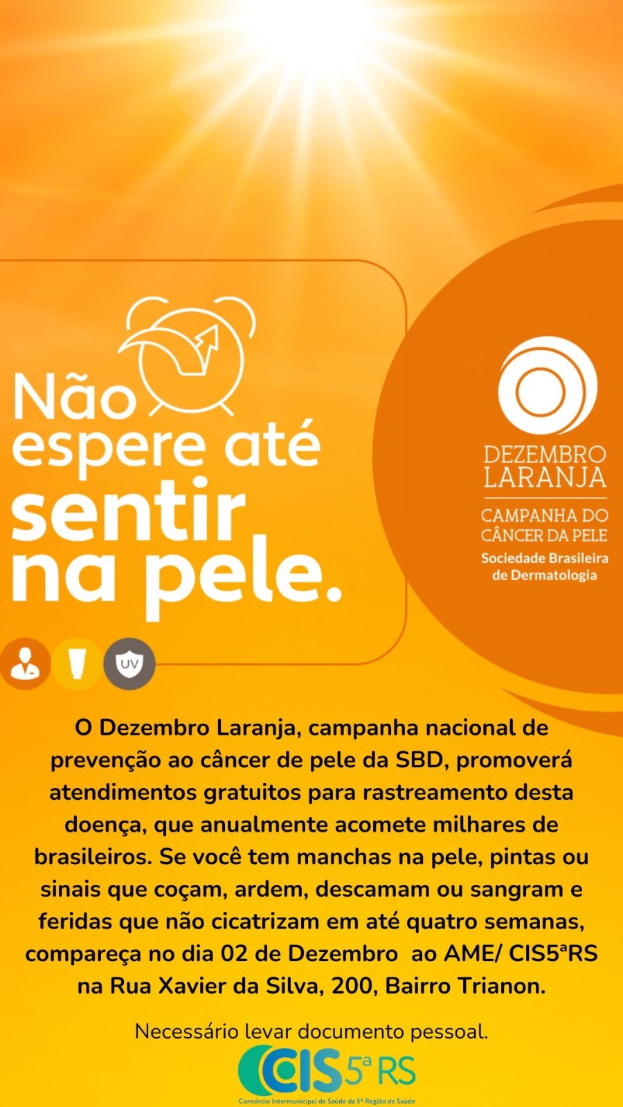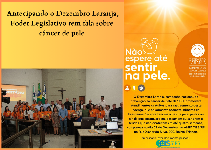 O CIS5ªRS/AME esteve presente na Sessão Plenária desta terça-feira, 21/11 na Camara Municipal de Vereadores, juntamente com a dermatologista Dra. Iara Rodrigues Vieira com a apresentação da campanha Dezembro Laranja, idealizada no Brasil pela Sociedade Brasileira de Dermatologia (SBD).