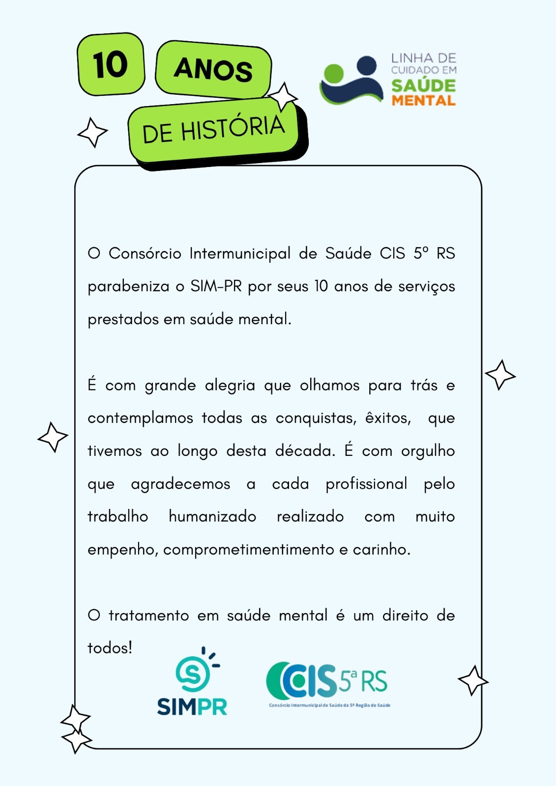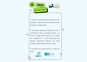 O Consórcio Intermunicipal de Saúde CIS5ªRS parabeniza o SIM-PR por seus 10 anos de serviços prestados em saúde mental.